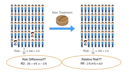 治療の成功や疾患の発現など、関心のあるイベントが起こる確率を「リスク」と表現することがある。試験治療を行うグループと標準治療を行うグループとの間で治療の成功確率を比較するなど、2つのグループ間でのリスクの違いを調べるような場合、結果の要約方…